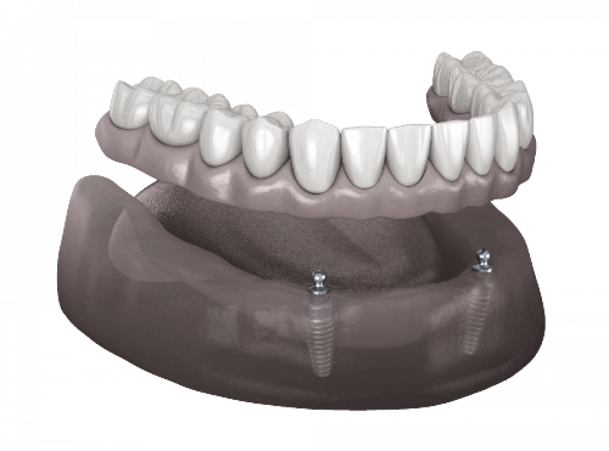 Tai ekonomiškiausias variantas, skirtas žmonėms, kurie nori pagerinti nuimamo protezo stabilumą. Į žandikaulį įsriegiami 2 implantai, ant kurių tvirtinami specialūs fiksatoriai (lokatoriai). Protezas lieka nuimamas, bet tampa daug stabilesnis ir patikimesnis.