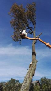 Avarinių medžių pjovimas prie namų virš stogų, virš aukštos įtampos laidų. Medžių pjovimas, medžių genėjimas, vaismedžių genėjimas.