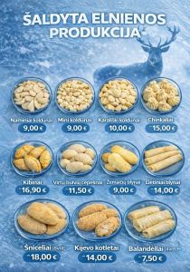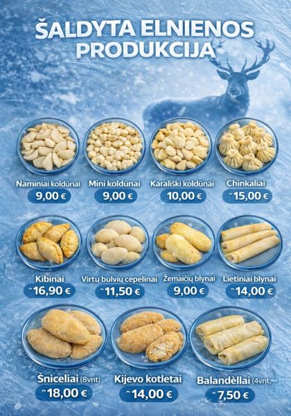 Išskirtiniai šaldyti elnienos gaminiai – koldūnai, kibinai, chinkaliai bei naminiai blynai.