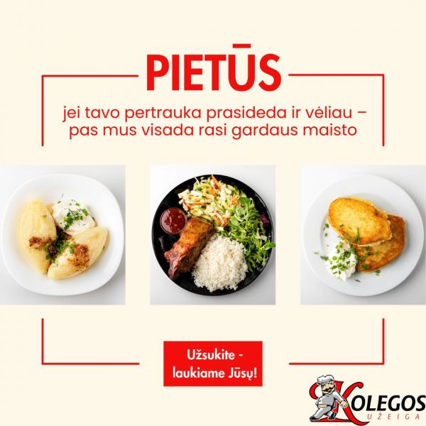 Veiklos apibūdinimas: Užeigoje „KOLEGOS“ kviečiame pigiai bei skaniai papietauti. Čia greitas aptarnavimas ir dienos pietūs, o maistas pagamintas su meile. Mūsų patiekalai pagaminti darbščiųjų šeimininkių rankomis, su meile, iš vietinių žaliavų pagal autentiškus receptus ir technologijas. Būtinai pasimėgaukite patiekalais, kuriais mes didžiuojamės ir kurie mus daro išskirtiniais.