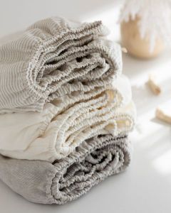 Lininiai maišeliai ir krepšiai vonios kambariui.