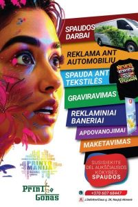 Visos reklamos gamybos paslaugos. Reklama ant transporto, drabužių, lauko ir vidaus reklamos gamyba, pripučiama reklama. Spauda ir spausdinimo paslaugos, lipdukų gamyba, termo spauda ant rūbų, maketavimo darbai.