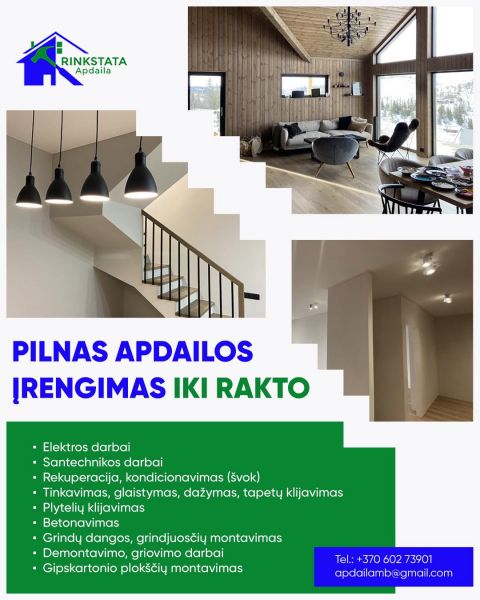 Vidaus, lauko apdaila, tinkavimo, glaistymo, dažymo, tapetų klijavimo darbai, gipskartonio plokščių montavimas.