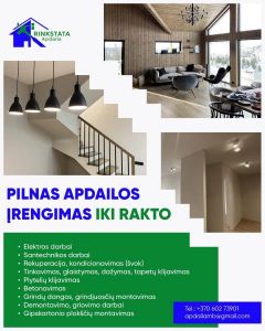 Veiklos apibūdinimas: Apdailos darbai Vilniuje, pilnas apdailos įrengimas iki rakto. Esame Jūsų patikimas partneris, siekiantis sukurti ne tik nepriekaištingą aplinką, bet ir ilgalaikius santykius. Sujungę profesionalumą, atsakingumą Jūsų projektą paverčiame realybe, užtikrinančia ilgaamžiškumą ir estetiką.
